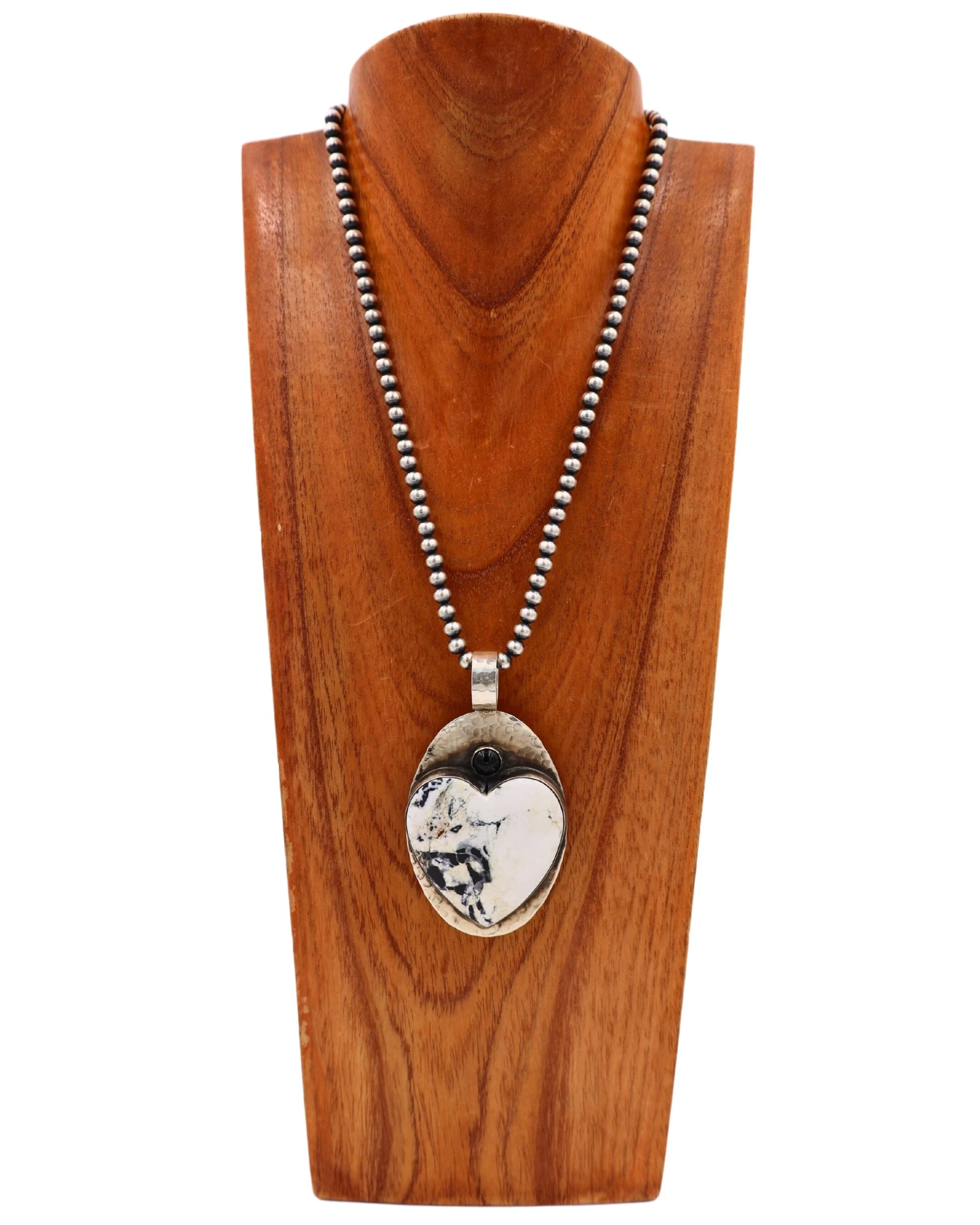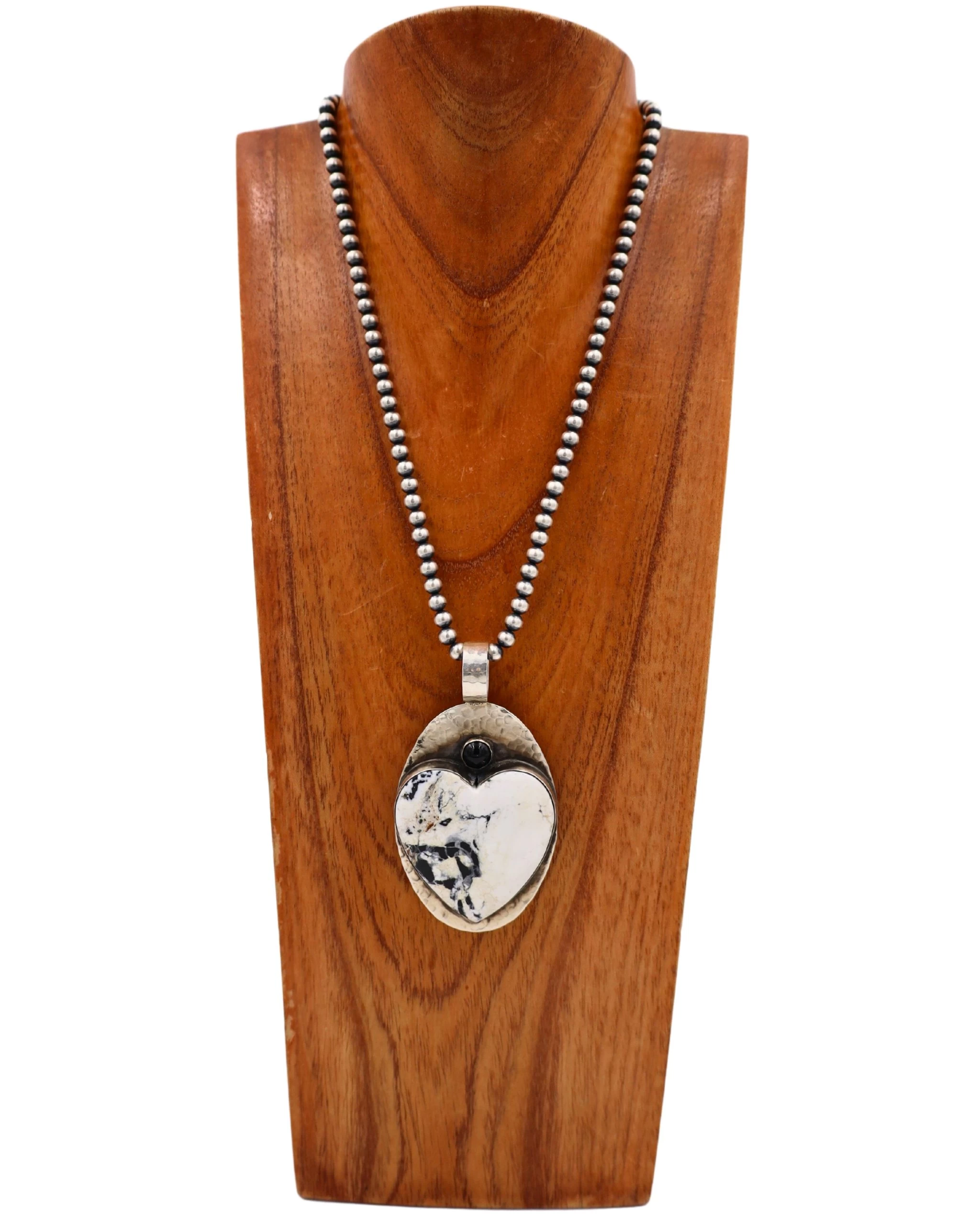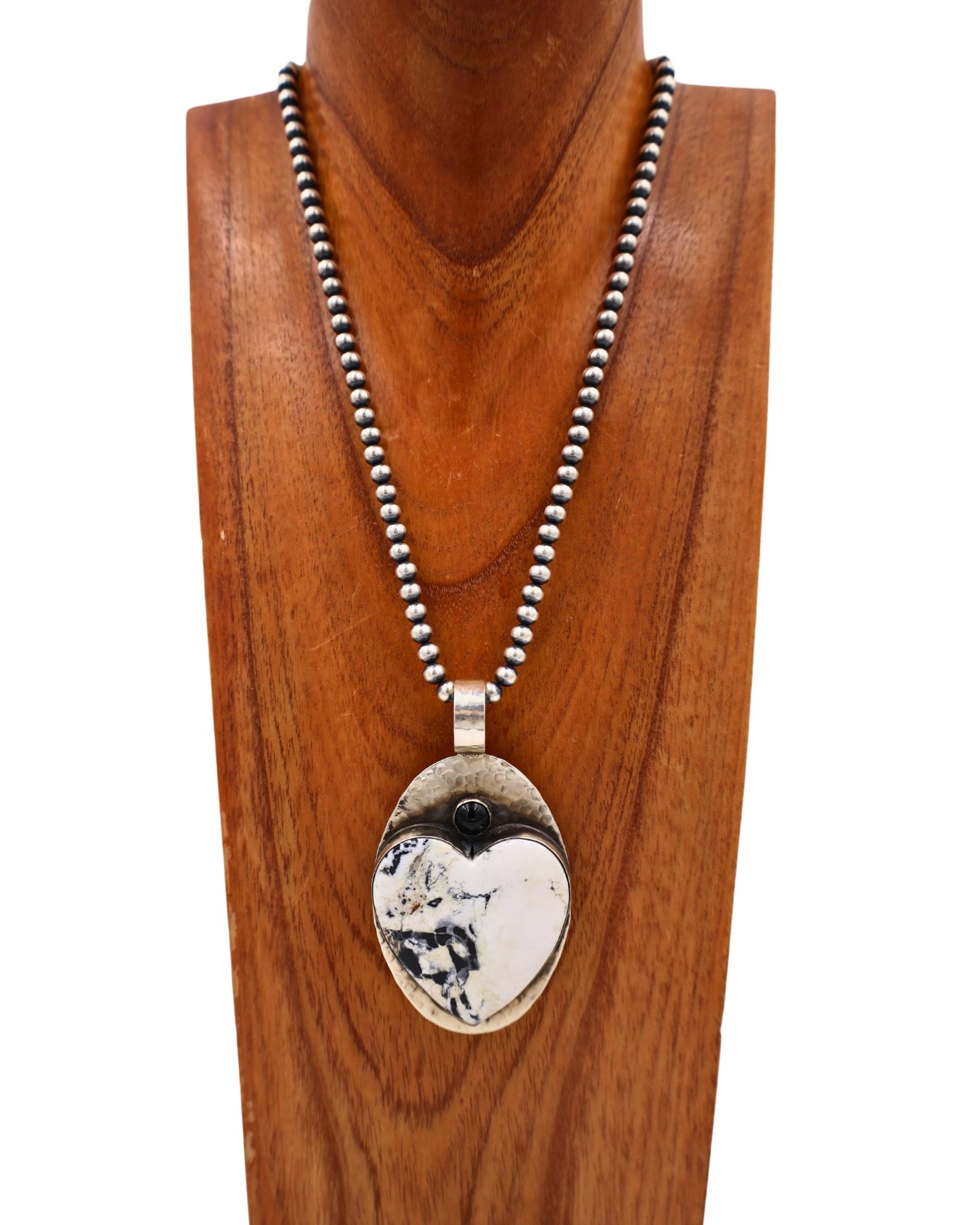 This large pendant handmade by Texas native Richard Schmidt highlights the multifaceted nature of the White Buffalo stone. Features a large slab of genuine White Buffalo plated on textured Sterling Silver with Onyx dot above it. Though simple in its design, this spectacular pendant is not understated in its beauty!