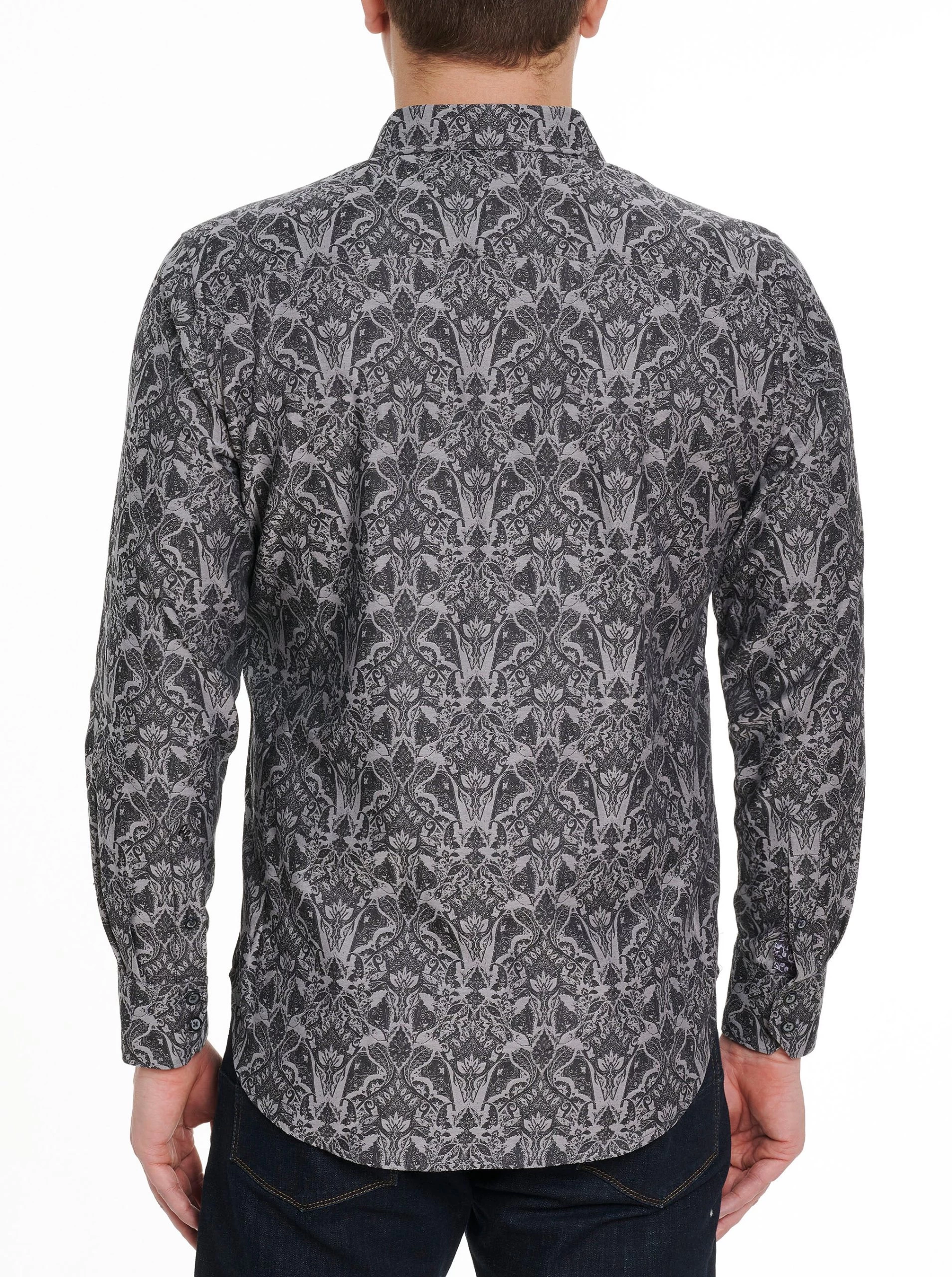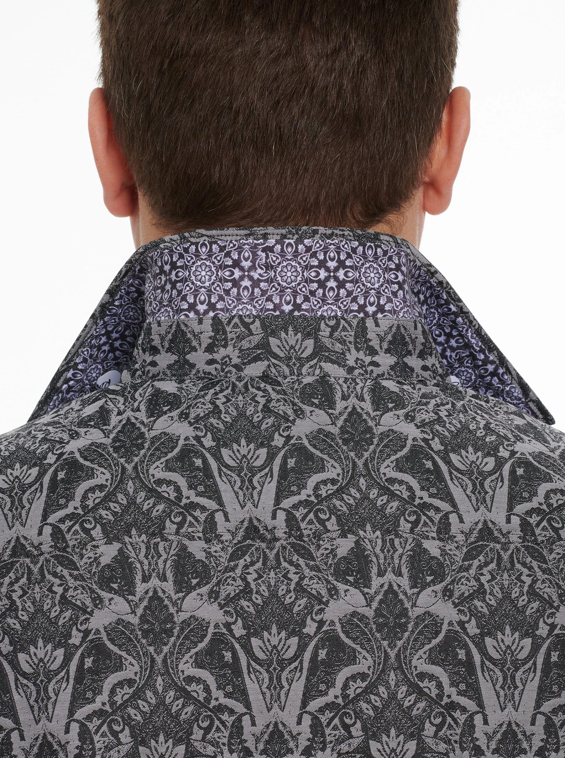 You loved The Andretti jacquard – an RG best seller and Collector favorite. Now discover our newest essential jacquard, The Highland. A damask motif is celebrated on this stretch cotton jacquard long sleeve button down shirt. Flip the collar for a contrast #WearableArt print.
