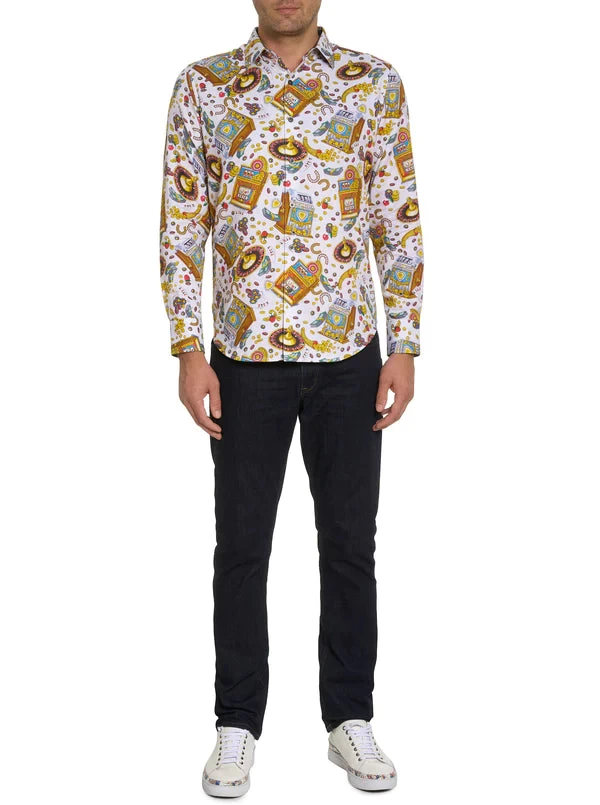 A kaleidoscope of gambling motifs and beading scatters across this allover print shirt in rich offbeat tones reminiscent of the hippie ’70s. From one-arm bandits and roulette wheels to atmospheric vestiges of Las Vegas tables, Lady Luck would swoon over this shirt, especially the gambling man emblem on back. #Flipthecollar and cuffs for a hands down winning look.
