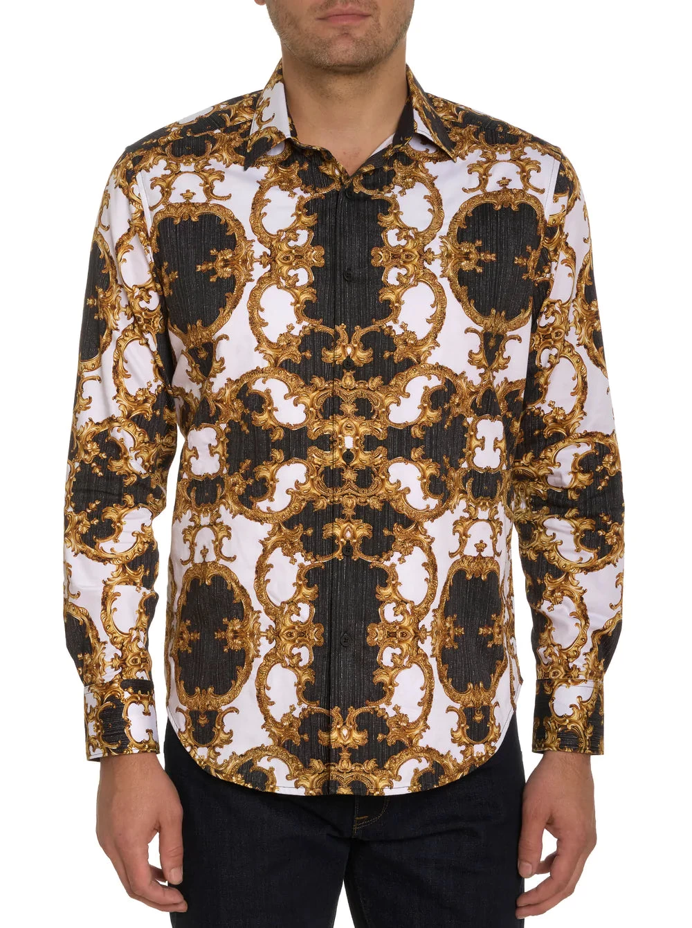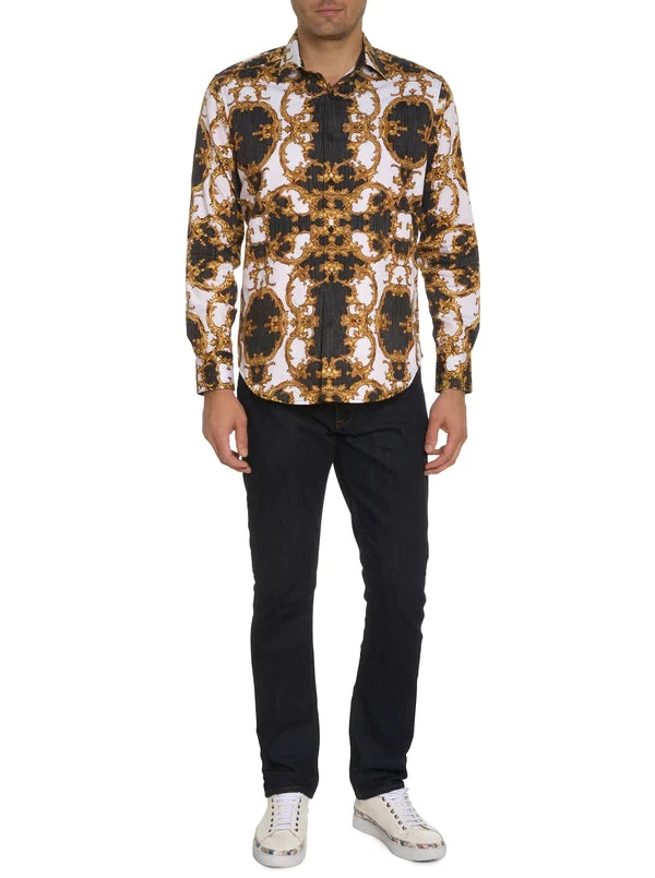 Aptly named, this long sleeve shirt reflects the ultimate in luxury, with a gold scroll print on damask fabric given texture and nuance with touches of rich embroidery. Ghosted in the background is a subtle tone on tone paisley pattern. Flip the cuffs for even more #WearableArt.