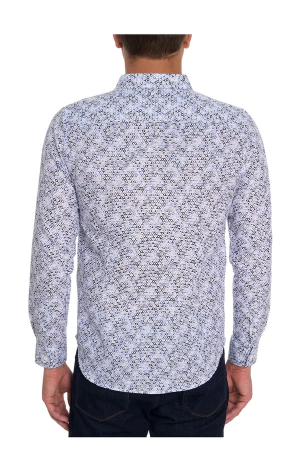 A tri-tone burn out geometric print gives dimension to this linen and cotton blend button down long sleeve shirt. Works really well with faded RG jeans.