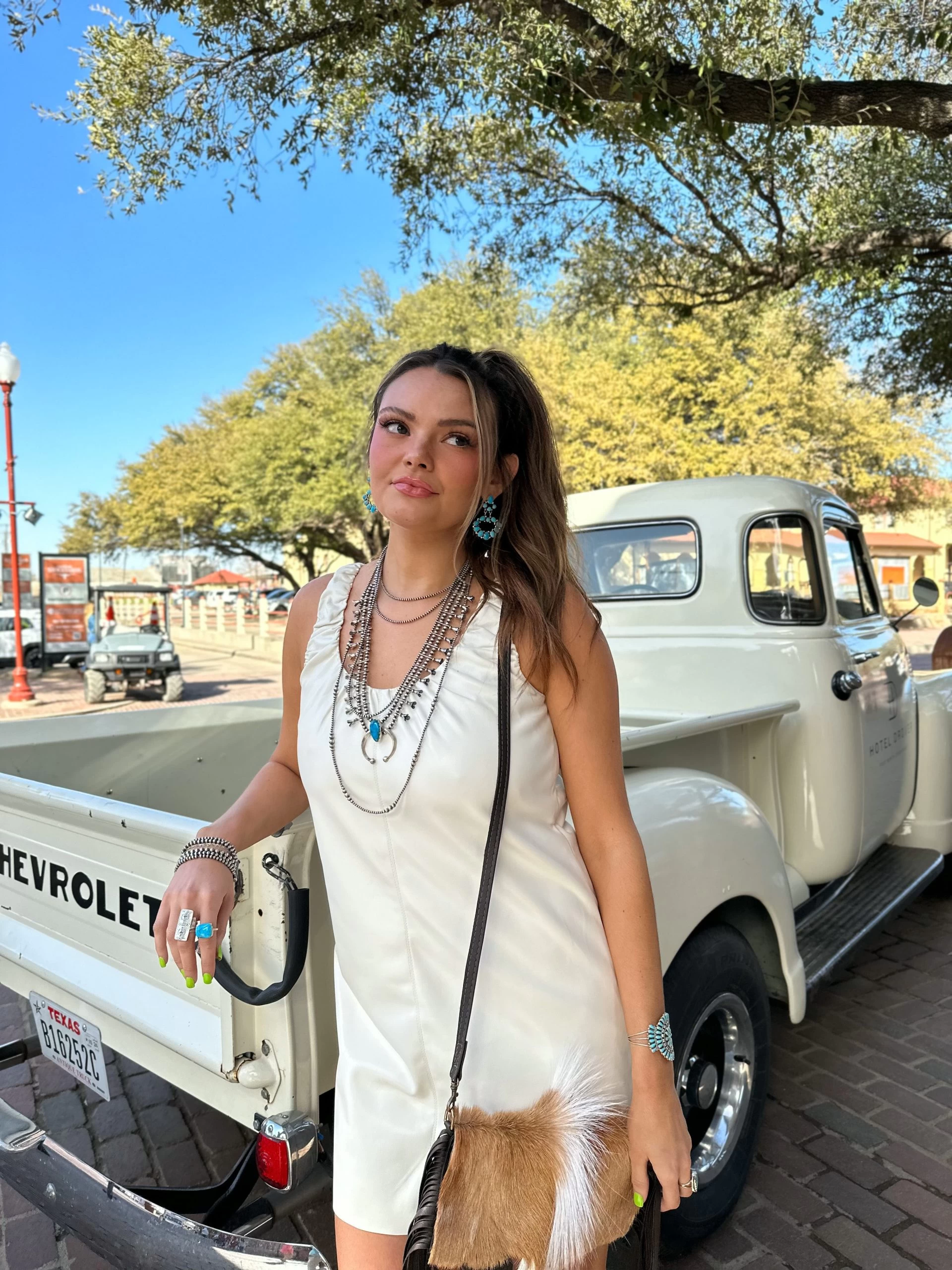 The front of the purse is adorned with soft and luxurious springbok fur, adding a touch of elegance to the design. Meanwhile, the fringe detailing on the sides brings a playful and bohemian vibe.