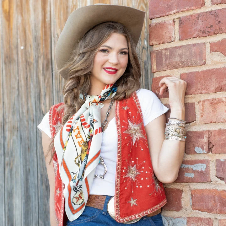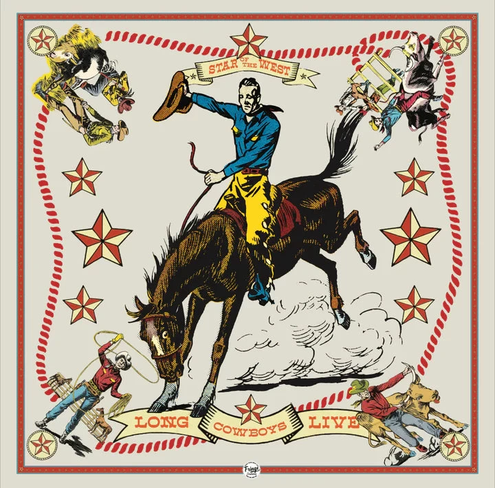 The Star Of The West is a 100% Satin Silk wild rag that has a BIG retro vibe to it! Vintage cowboy graphics with rope border and stars highlighting corners. This is a fun one and will last for years to come!