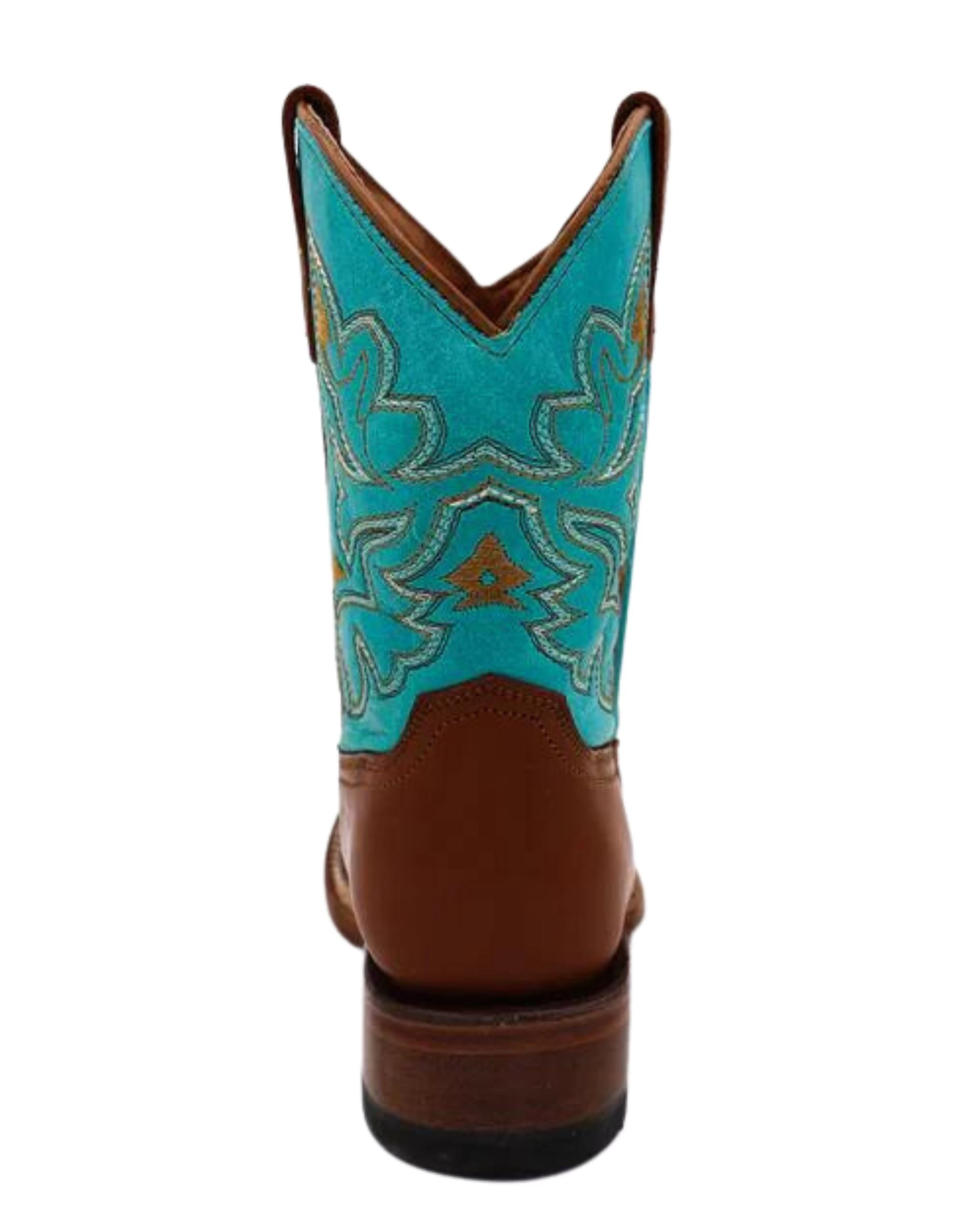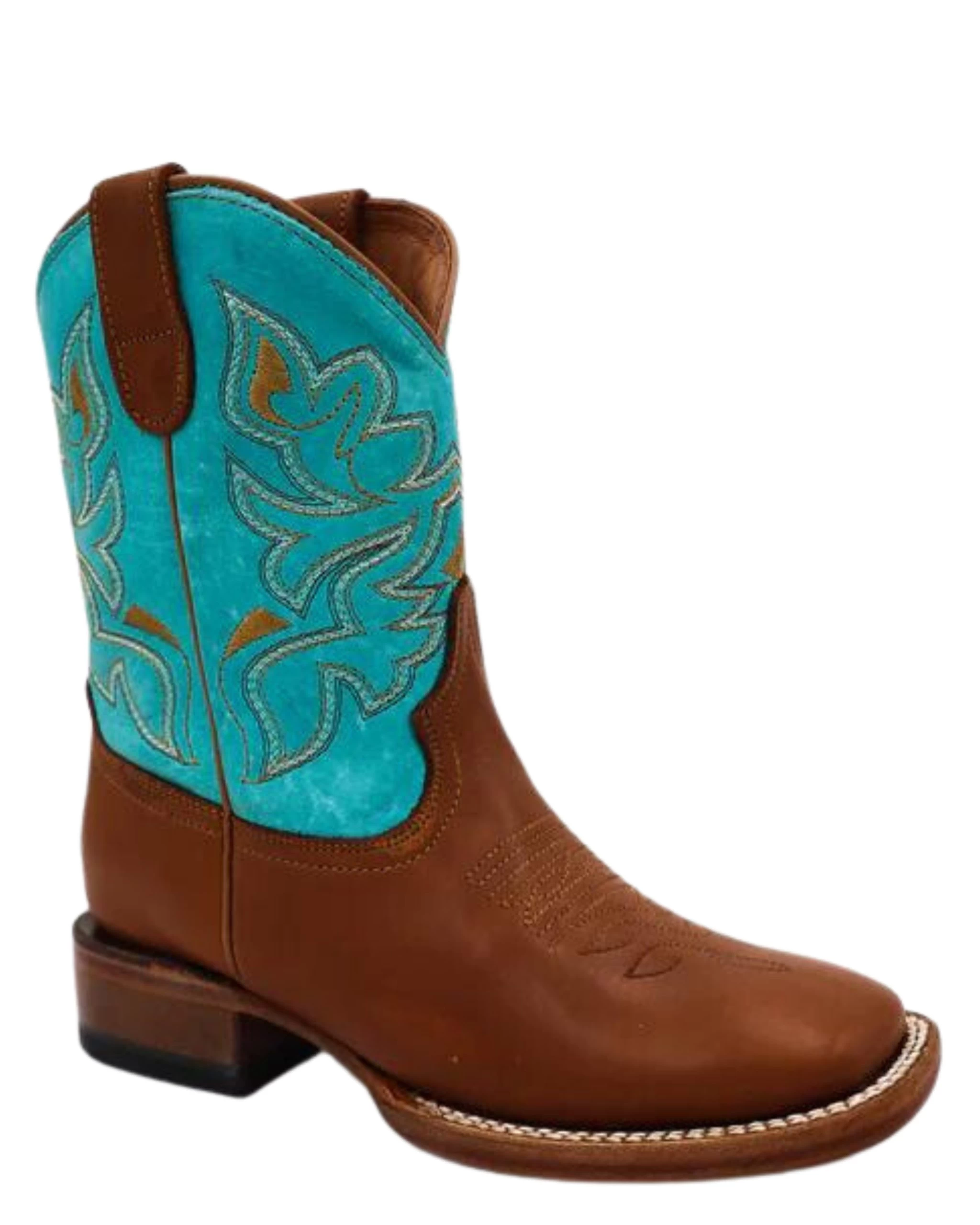 These precious leather boots by Tanner Mark are the perfect staple for your little cowgirl! The vamp is made of smooth brown leather with embroidery on the top. The shaft consists of distressed turquoise leather adorned with elaborate brown and white embroidery and brown leather pull straps. Mixing classic design with colorful twists, these adorable boots are sure to become your child’s new favorite pair.