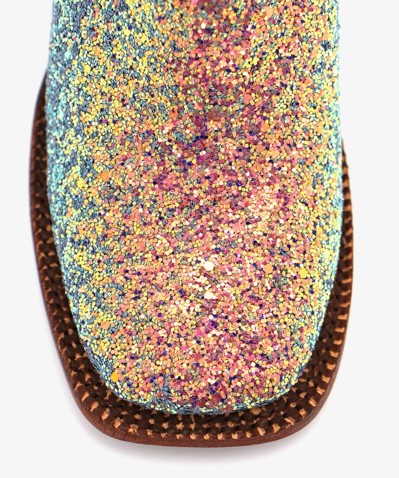 It’ll be hard to not be dazzled by your little cowgirl in these sparkling boots. They feature a dazzling glittered exterior and are lined soft leather. The glitter is securely adhered to the boot, ensuring little wear and tear. Other details include pull tabs, square toe, leather lining, leather sole, double welt stitch, and a 1-1/4″ heel. Shaft length will vary with shoe size. Youth sizes 3-6 (whole sizes only).