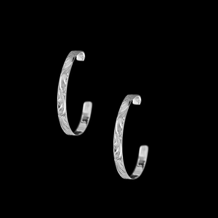 An all-time classic hoop inspired by a true Western Lady, The Clara Countryside Hoops are fully engraved sterling silver and measure 2 1/4″ in diameter.