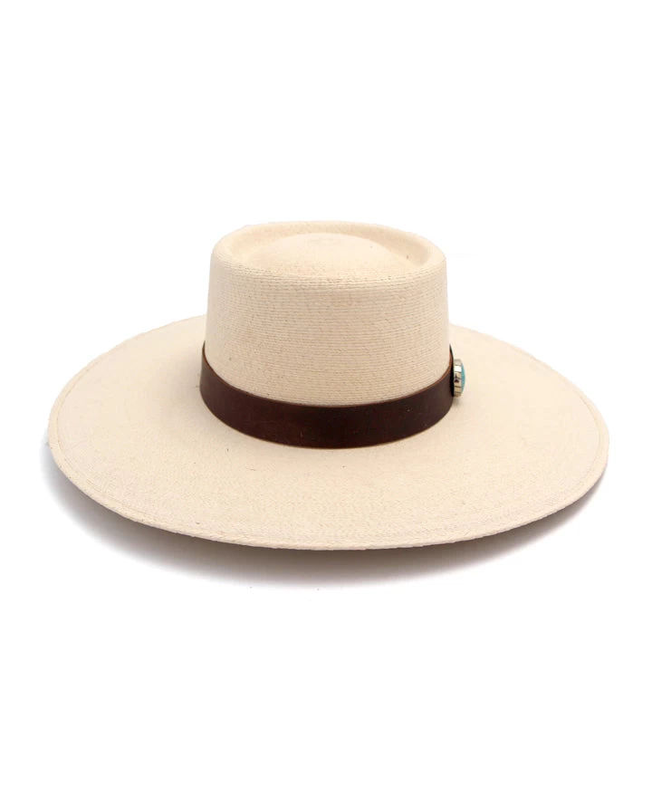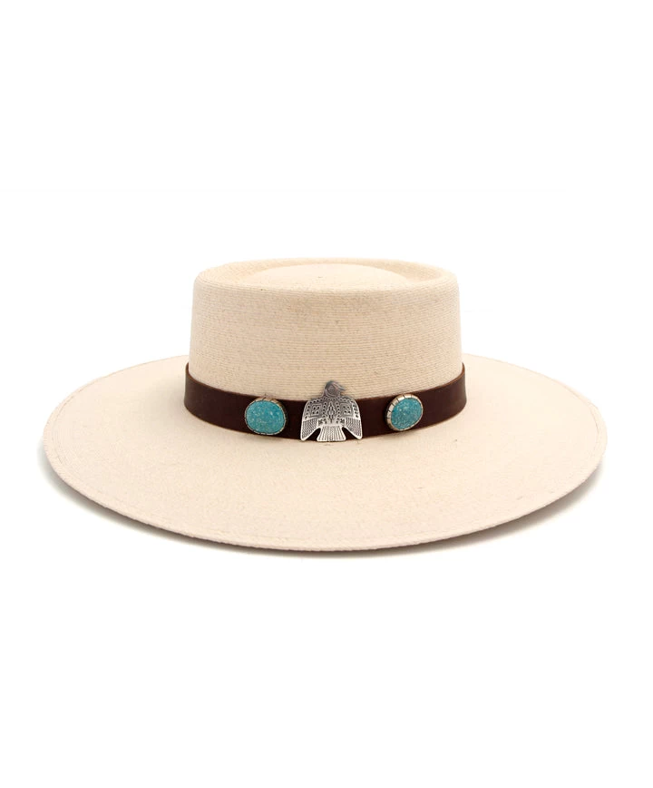 A true style piece for your Spring and Summer closet, this Palm Hat features a Leather Hatband with two turquoise stones and a Thunderbird pin