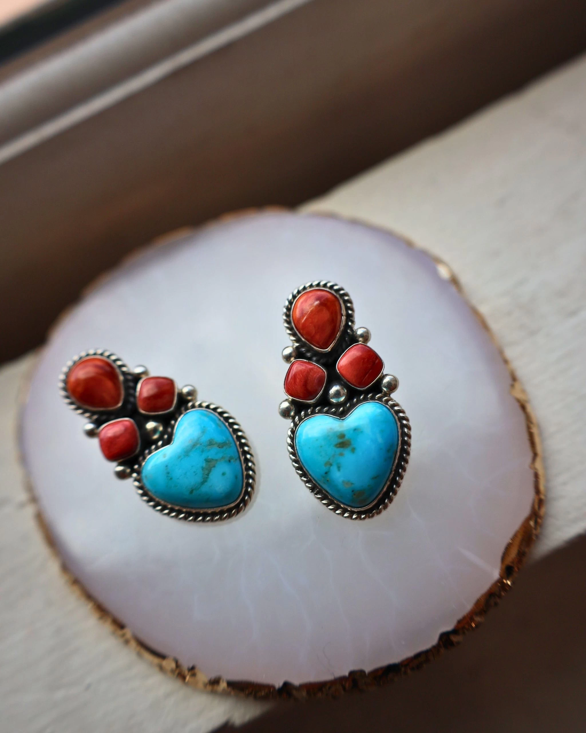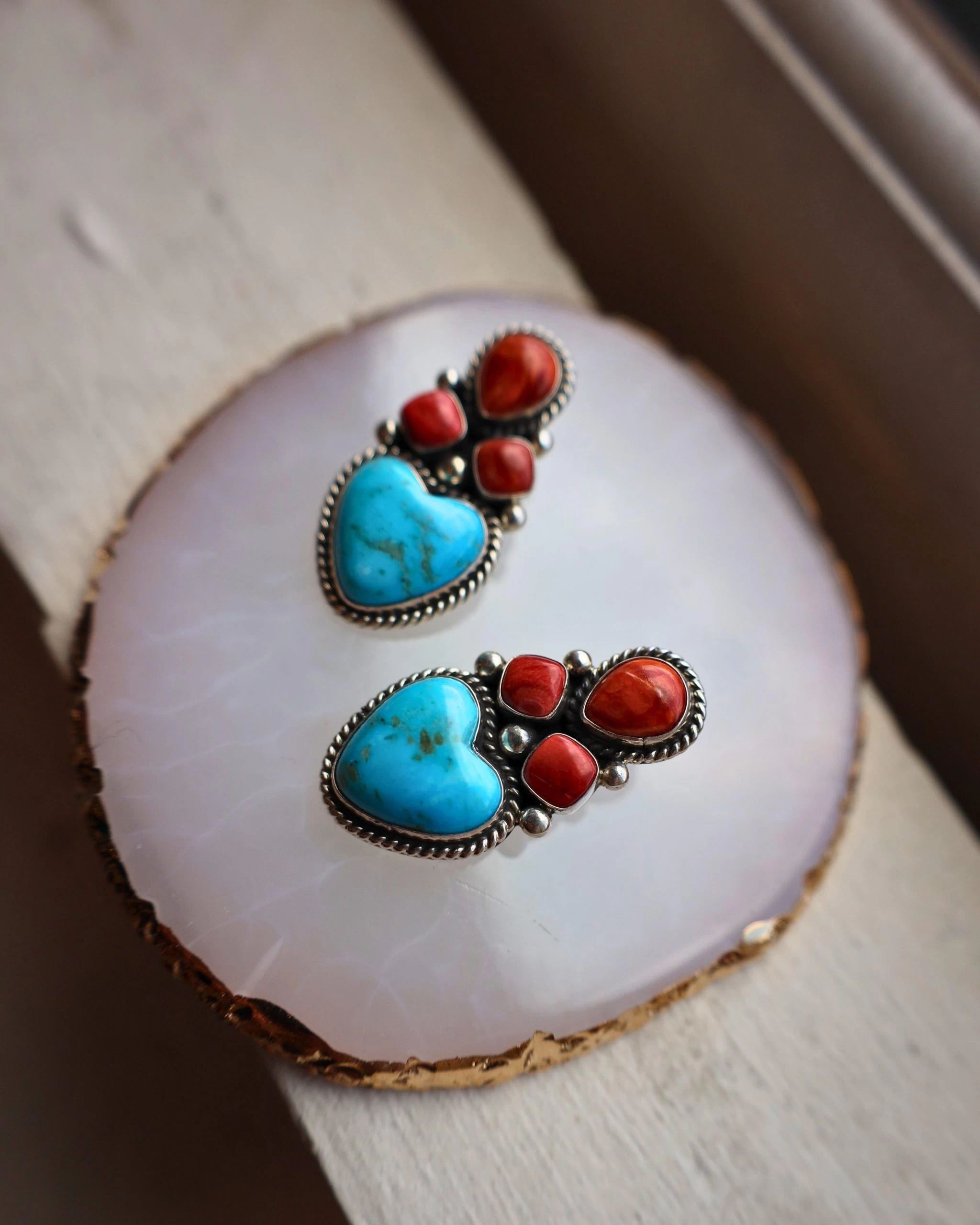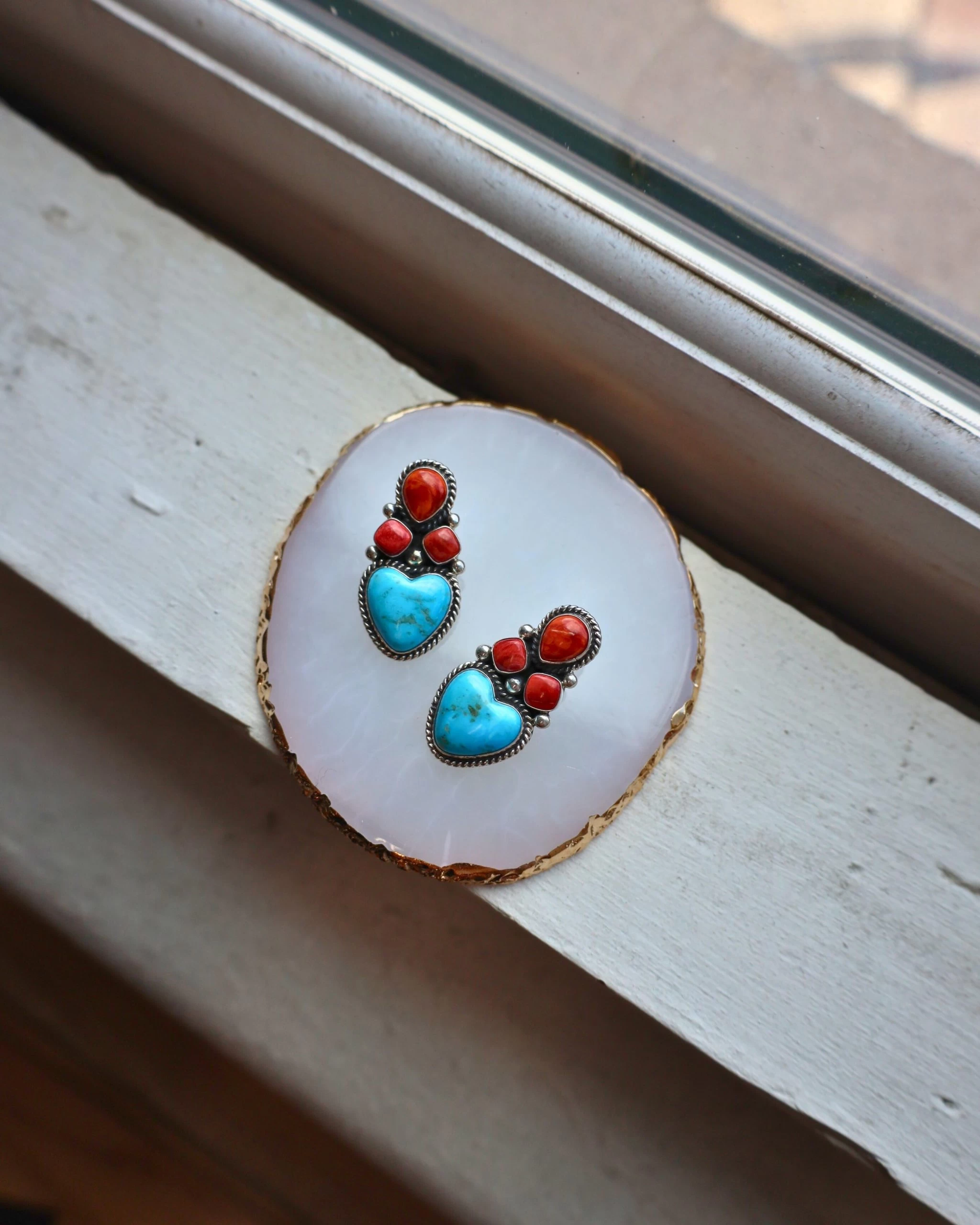 Add an exciting pop of color to your look with this gorgeous pair of Navajo turquoise heart earrings. Each earring features a turquoise heart with three red spiny oyster dots above it, all set in a sterling silver bezel. Feel the power of a timeless tradition with these exquisite earrings!