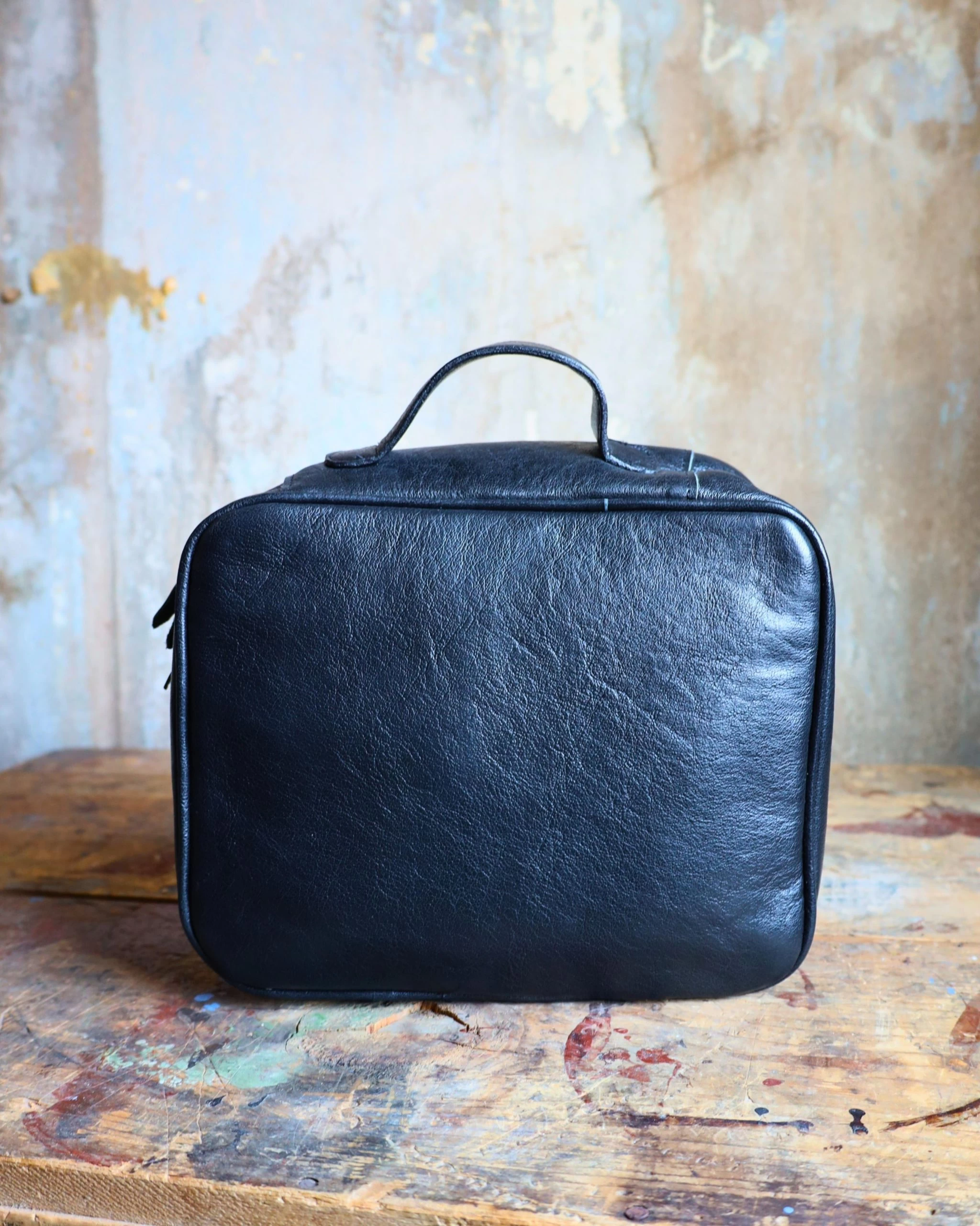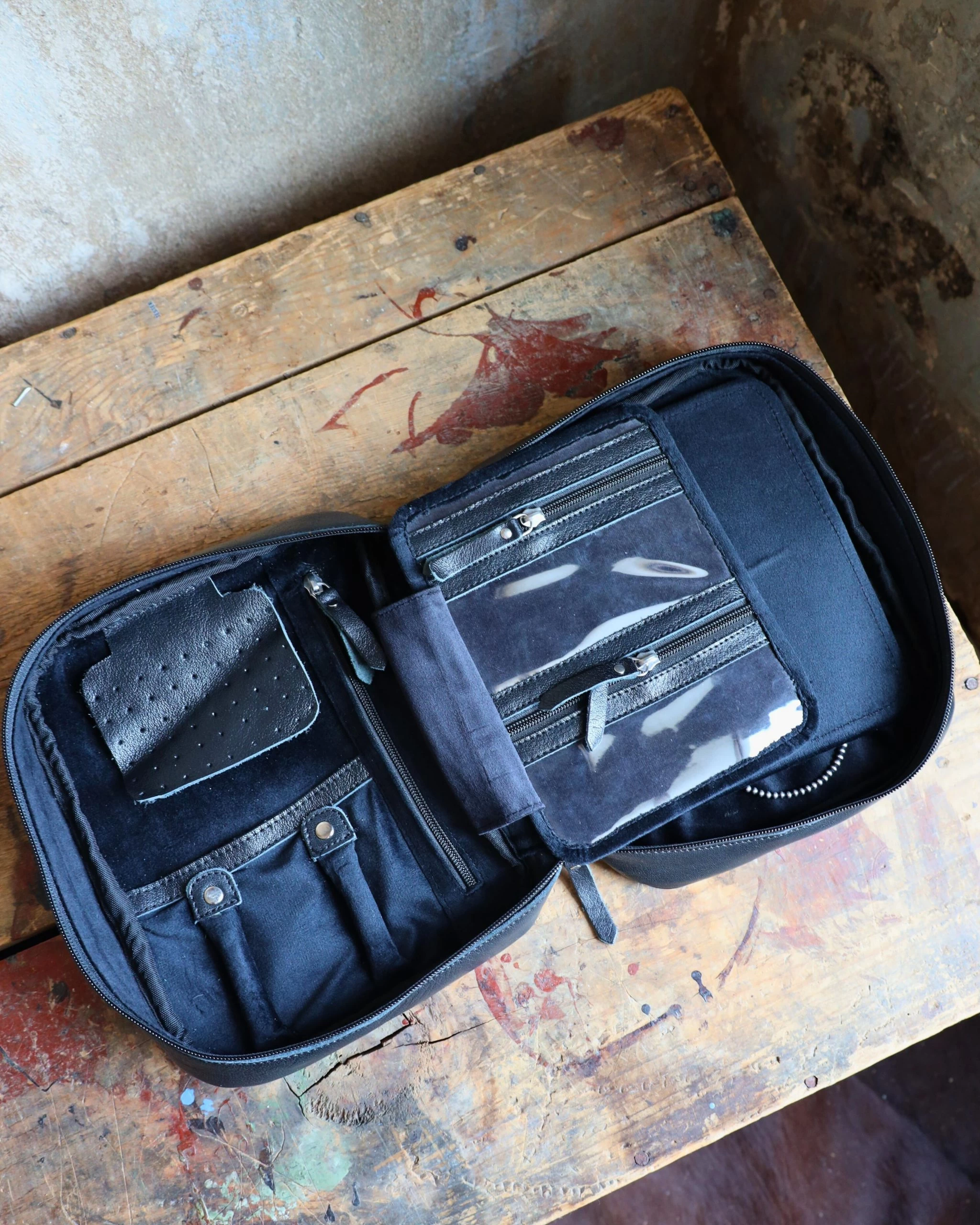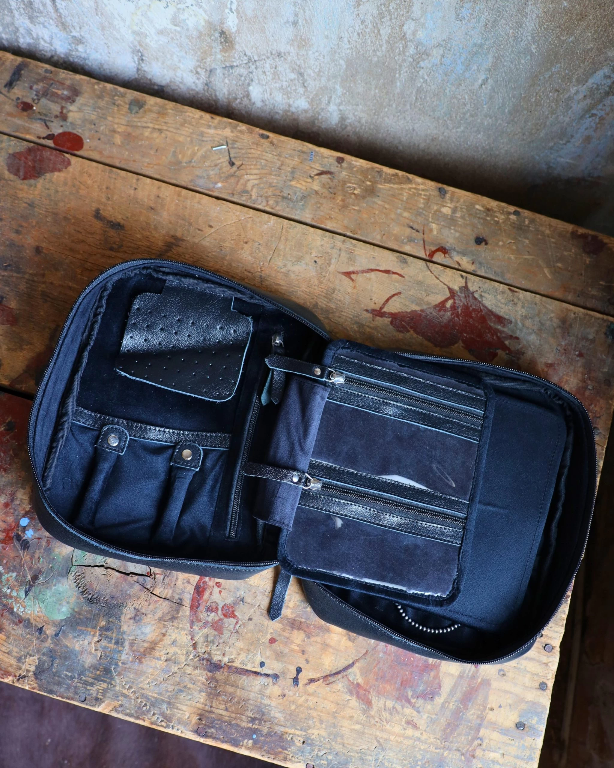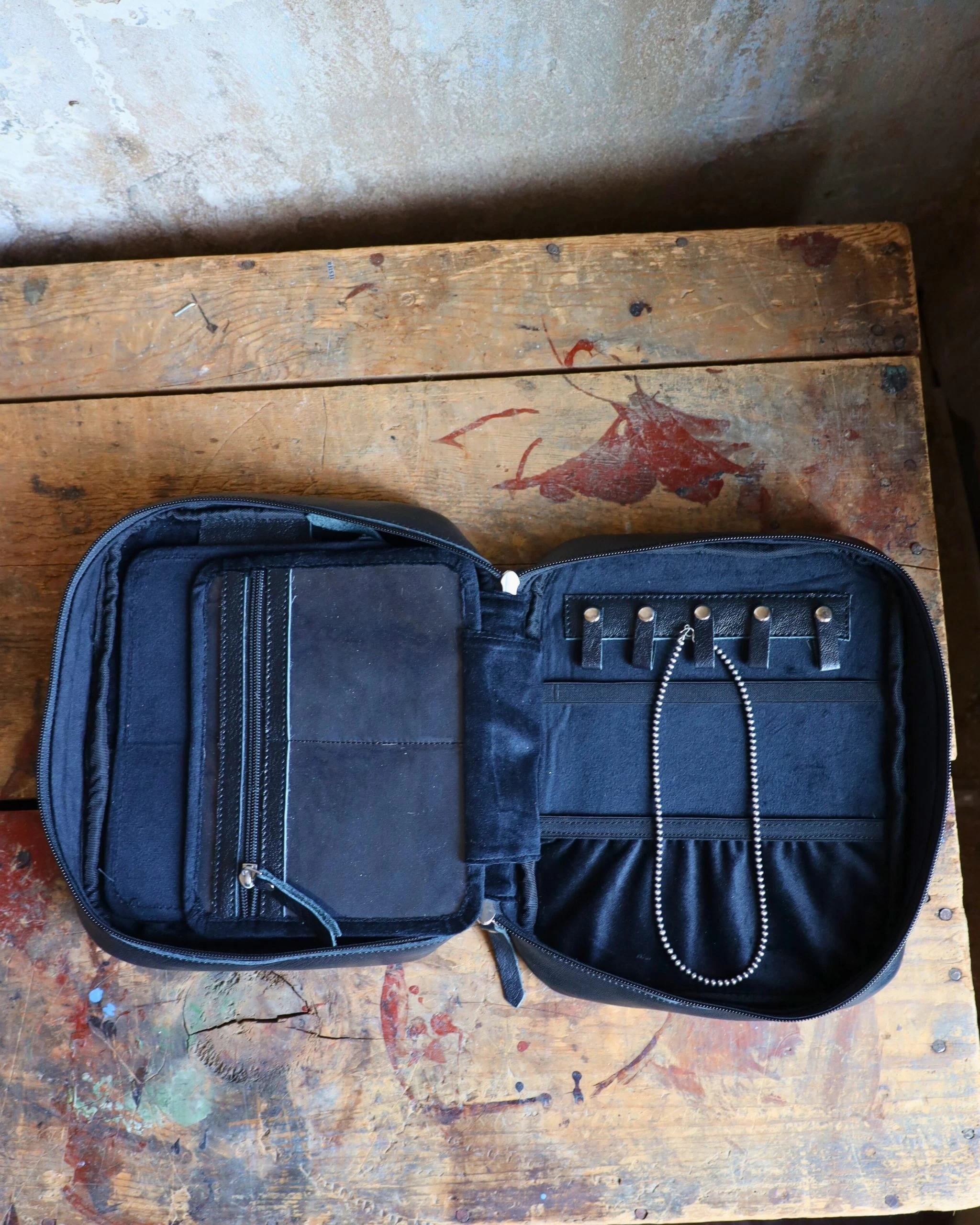 My new “jewelry book” with protective plush velvet “pages” with zippered clear plastic compartment’s. Extra leather patch with holes for more post earrings, 2 snapping rows to slide your rings, more zippered pockets and snaps for necklaces. Entire bag zips closed. Natural Hair on cowhide (pattern varies) and leather with tooled leather patch with buckstitch lacing and tooled leather handle. Measures 10”X 8”. Interior is black velvet .