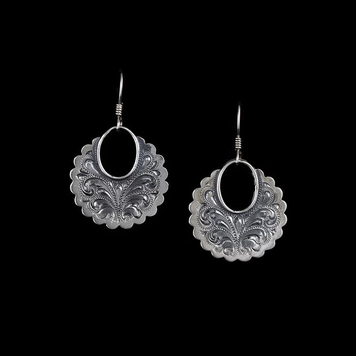A hands-down best seller, the Clara Scallop Blooms feature an open oval framed with a smooth sterling wire and fully hand-engraved scalloped discs. These gorgeous drop earrings are made of pure sterling silver, but are light and delicate enough to wear all day. Measures 1 3/4″ across with sterling French hook wires.