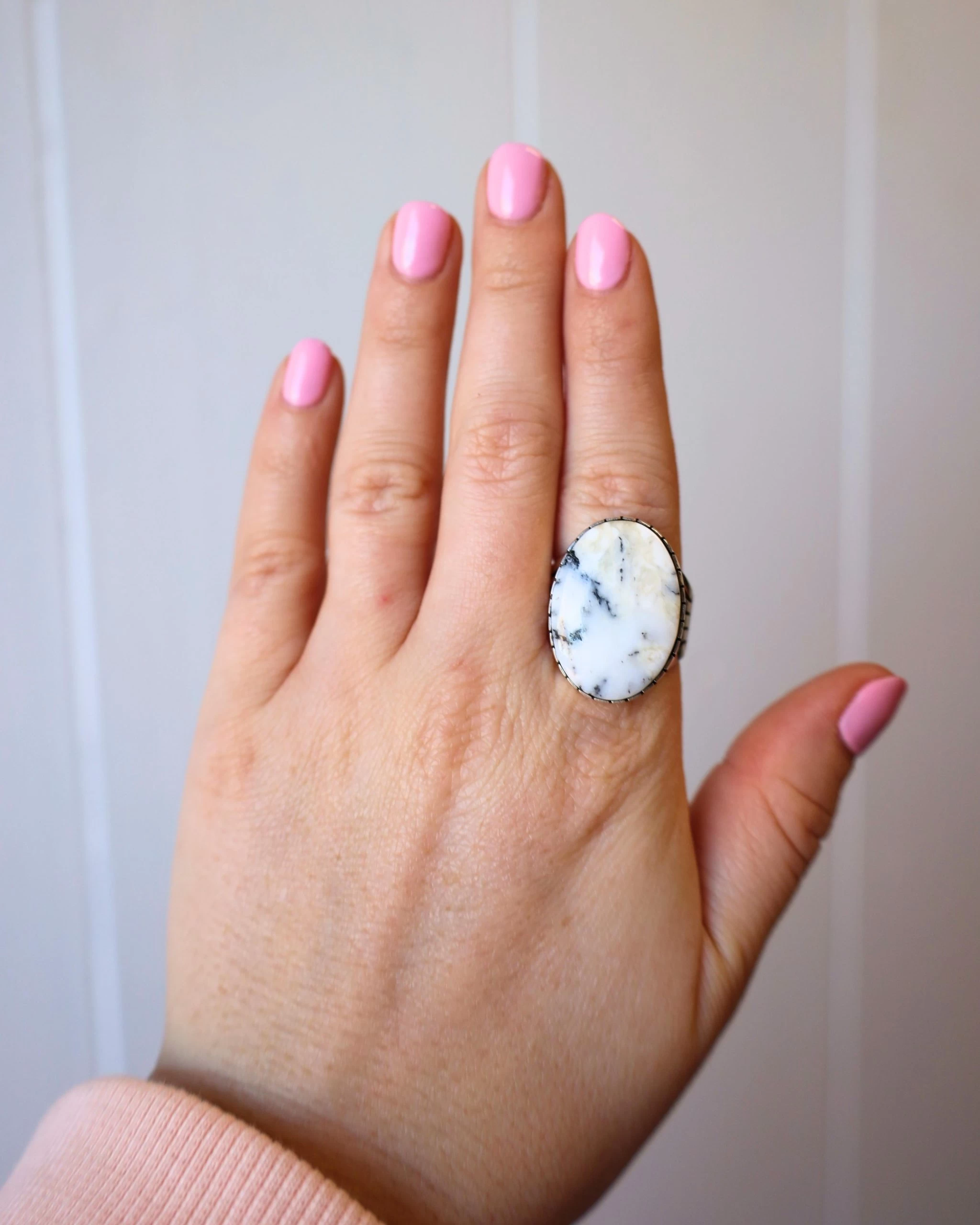Crafted from high-quality sterling silver, this ring features a beautiful white buffalo stone that is said to symbolize purity, strength, and prosperity. The stone is carefully hand-selected and set into a classic yet modern design, making it the perfect everyday accessory for any style-conscious individual.