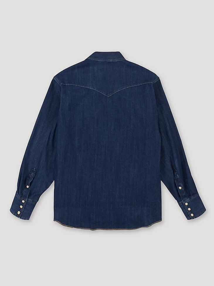 One wardrobe staple a cowboy should never be without is a work shirt that can hold its own. That’s precisely why our Cowboy Cut® work shirt is designed with hard work in mind, so you can get any job done with total confidence. Every Cowboy Cut® work Western denim snap shirt comes with all the authentic details you’d expect from a tried-and-true Wrangler® essential, including Western front and back yokes, a spread collar, two spade flap snap pockets, the Wrangler® logo riser label on the left pocket, and our decorative ‘W’ stitching. Just like the jeans in our Cowboy Cut® collection, the Cowboy Cut® Western snap denim work shirt will keep you dressed and ready for anything.