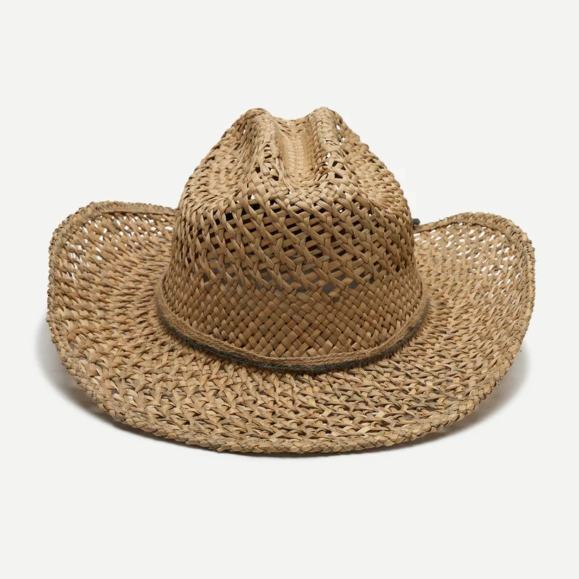 Handwoven with 100% seagrass straw, our Jessica cowboy hat is a closet staple. She features a classic cowboy pinch, structured upturned brim, open weave, and jute rope trim.