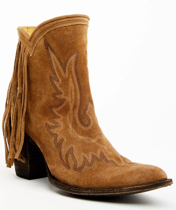 Get your business together, because these is a new Sheriff in town. Rich tan suede leather with tonal stitching and fringe details, elevated in a fashion forward silhouette with a higher heel and almond toe. Inside zipper for added convenience.Â