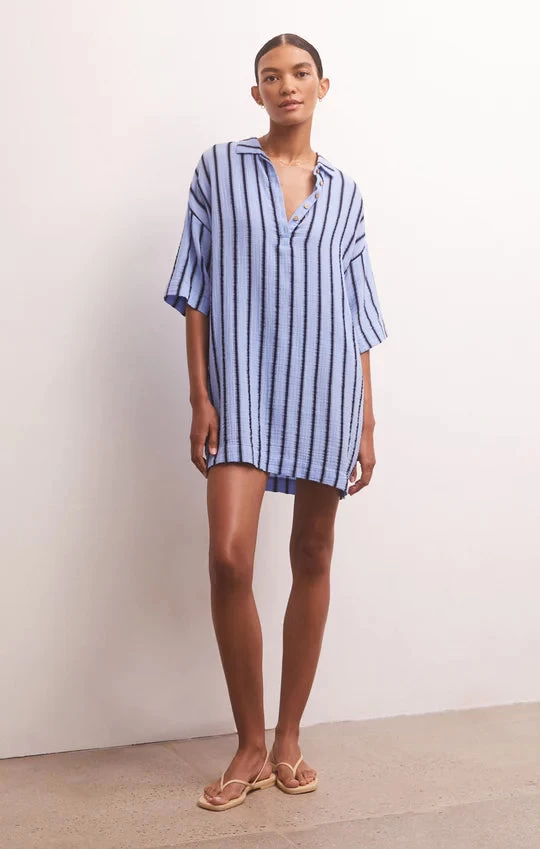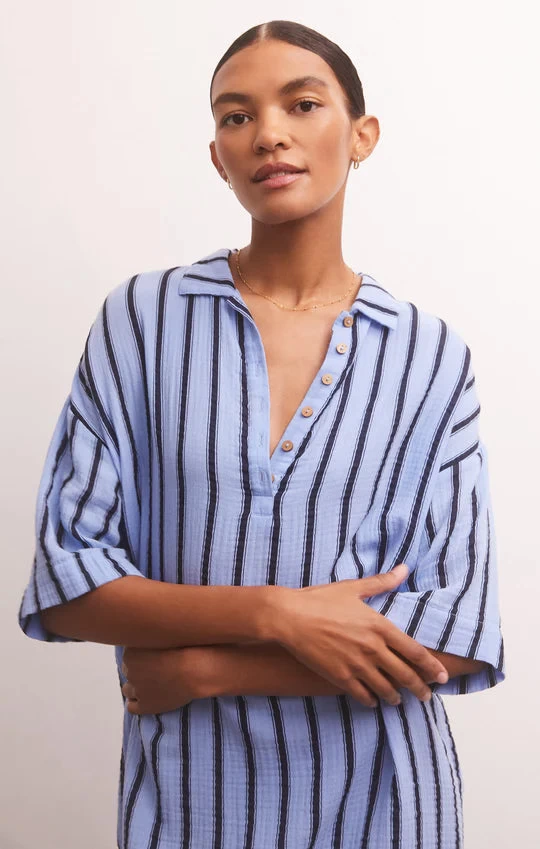 The Beatrix Stripe Mini Dress is the perfect dress to throw on and go! Designed in our 100% Cotton Textured Gauze with a beachy stripe pattern, this collared, oversized style features a half button front, center back yoke, and side slits. Add a belt for a more fitted look.